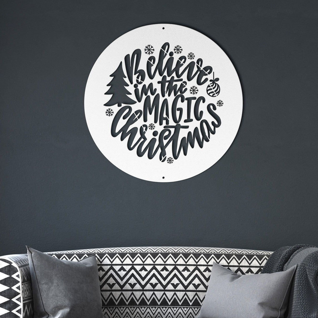 The Believe in the Magic Christmas sign features a "Believe in the Magic Christmas" saying with christmas accents. The laser-cut steel sign is available in a variety of colors — each perfect for the holiday decor you desire. Each piece has a baked on powder coating to offer a durable finish that can be used indoors or outdoors. Use it to add a unique piece to your holiday collection that will last for years to come.