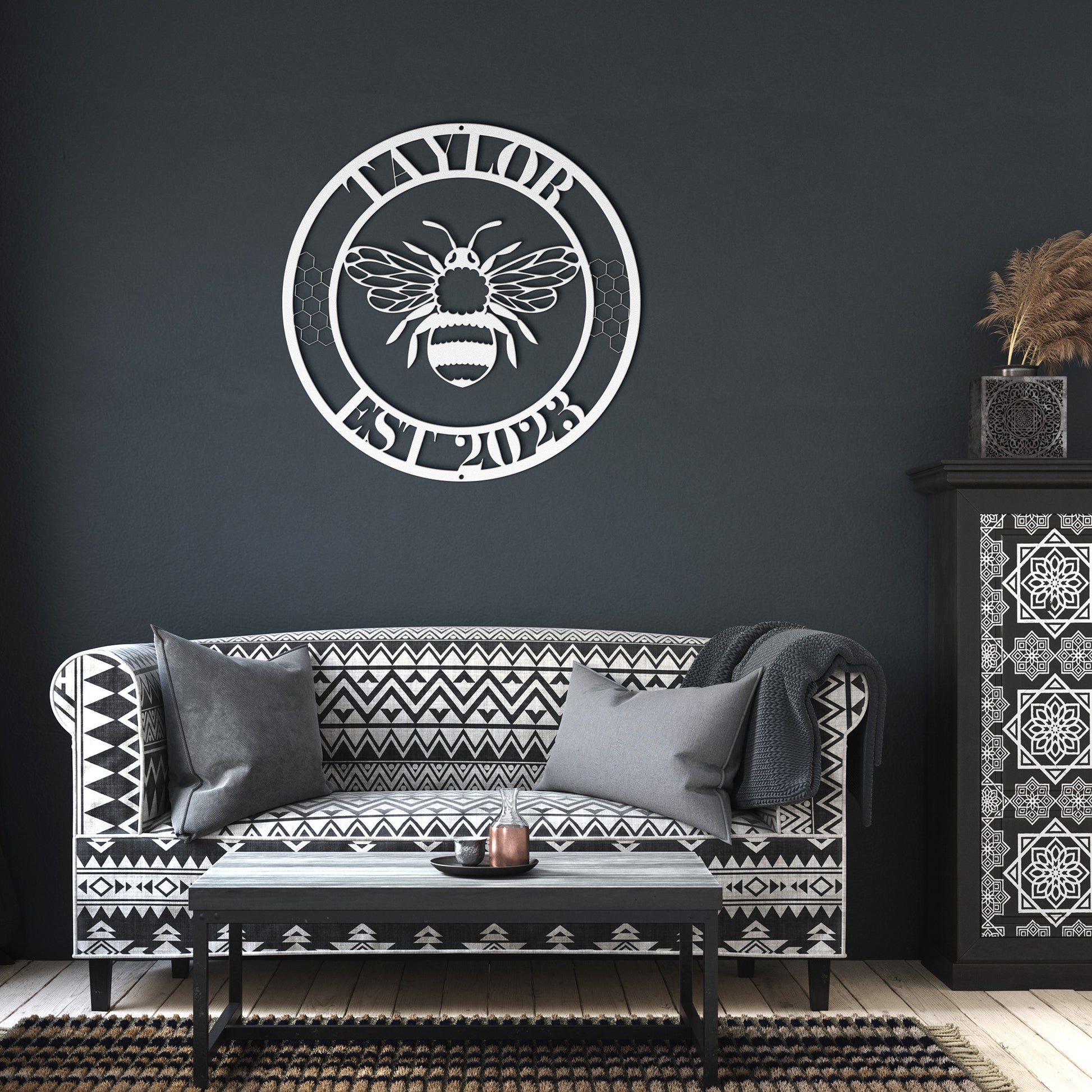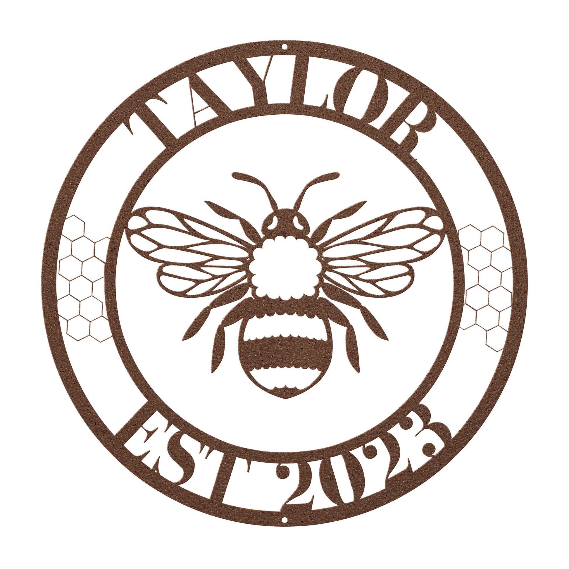The Customizable Bee Name and Date metal sign features a prominent bee surround with the family name and the family established date. This is perfect gift for a unique porch sign or home decor piece. The laser-cut steel sign is available in a variety of colors — each perfect for the individual style of your home. Each piece has a baked on powder coating to offer a durable finish that can be used indoors or outdoors. Use it to add a unique piece to your home that will last for years to come.
