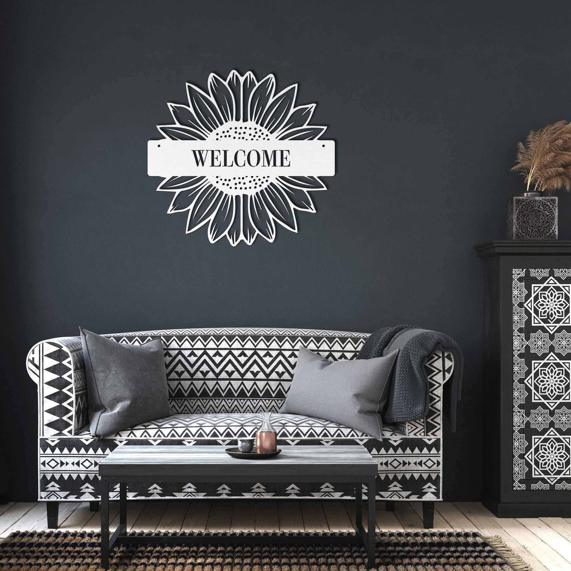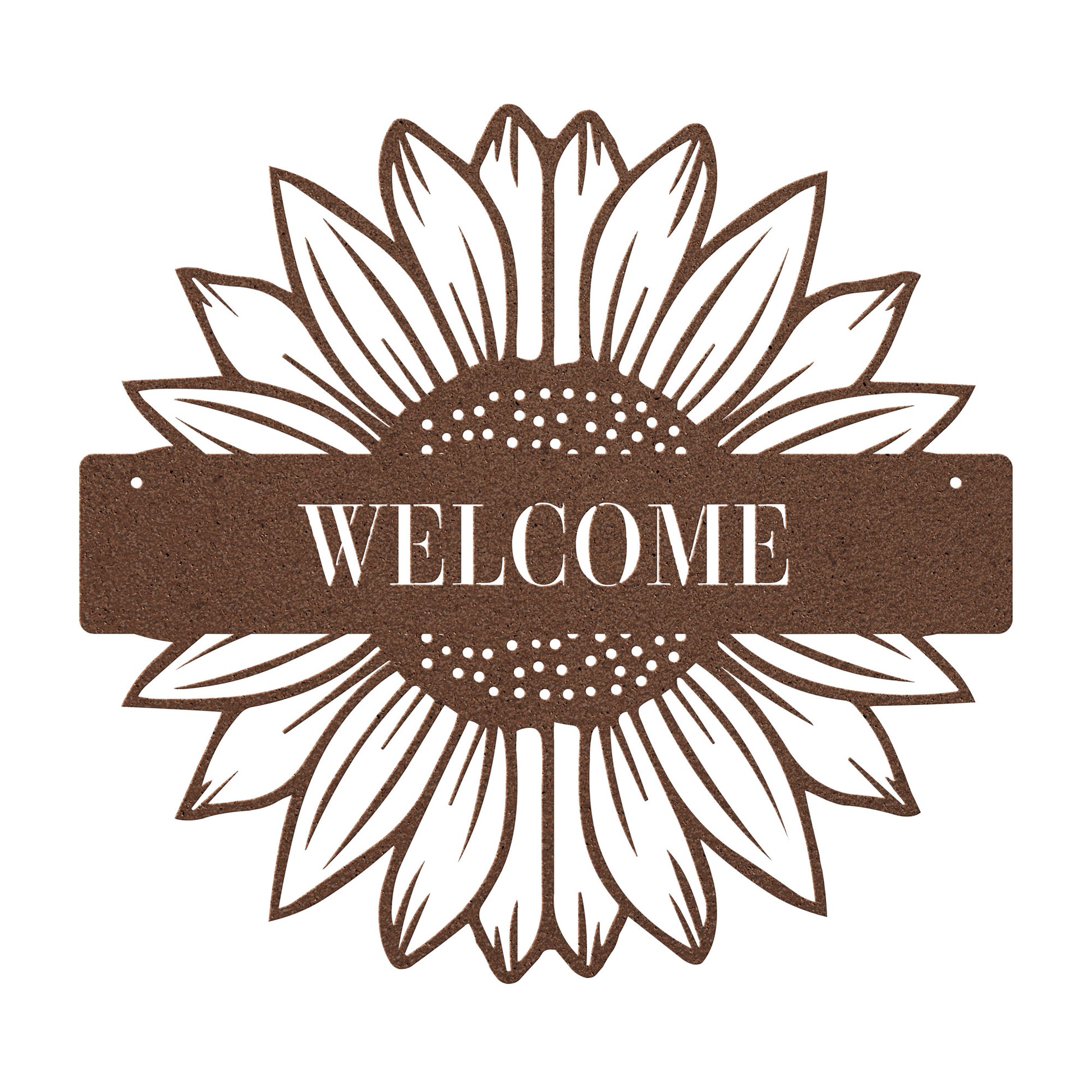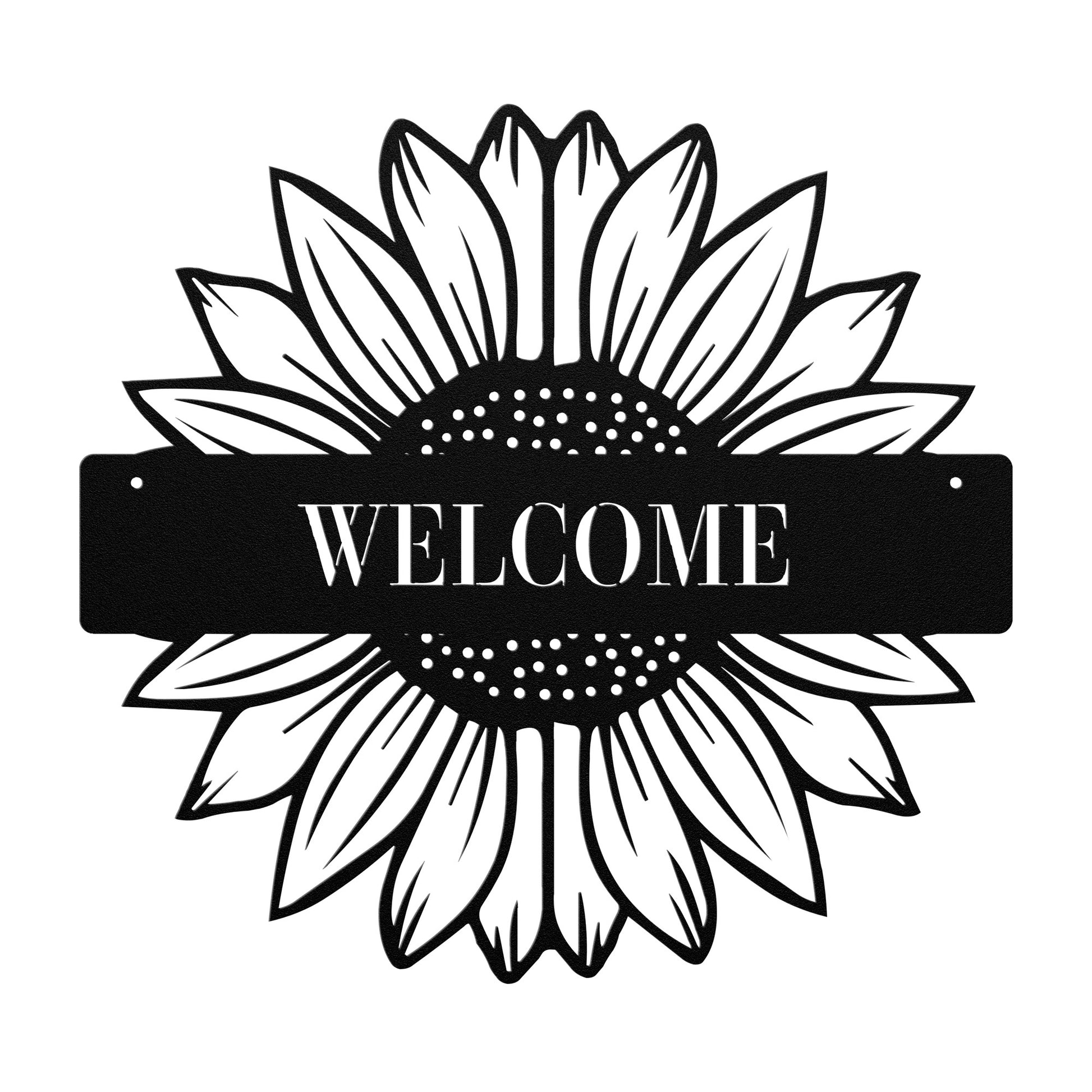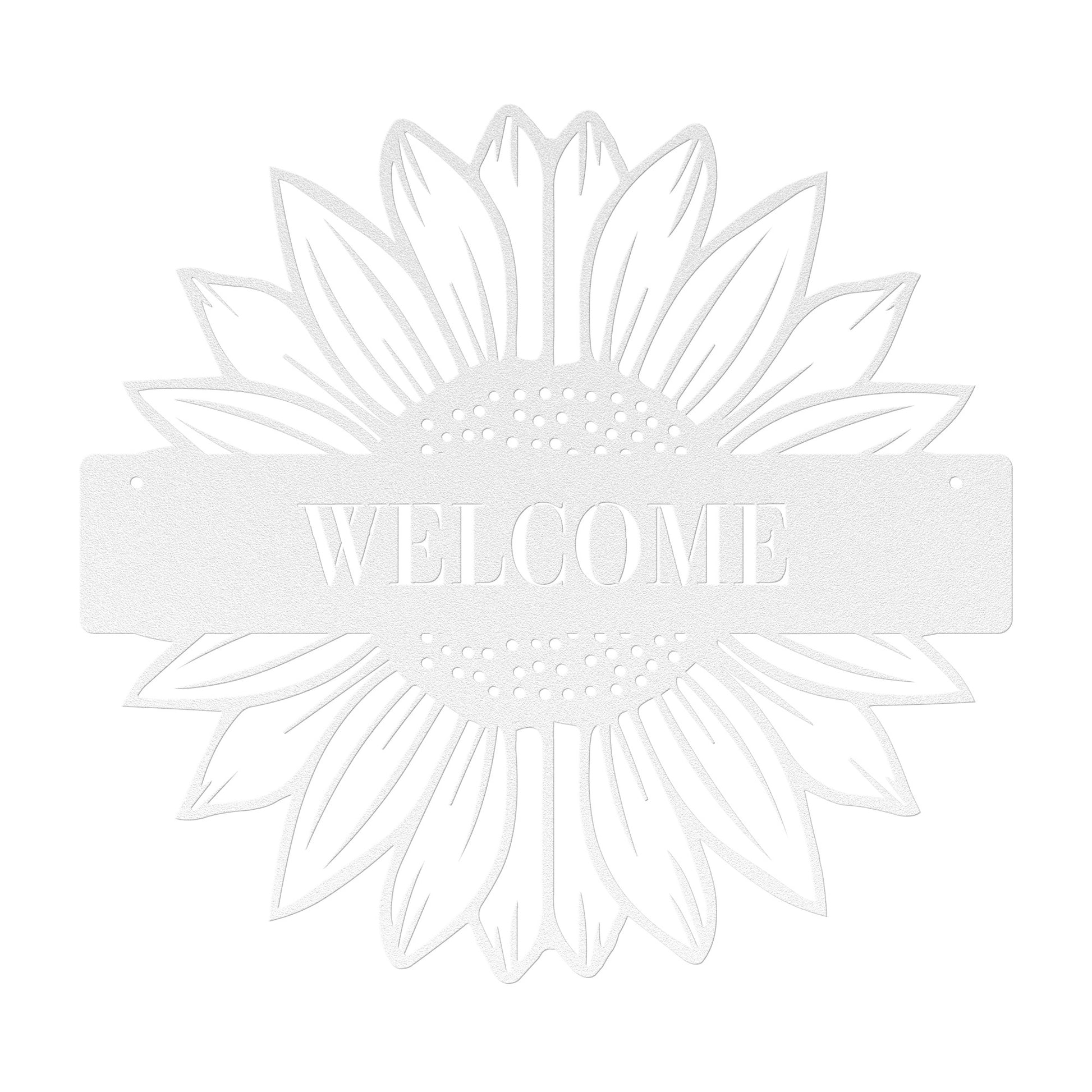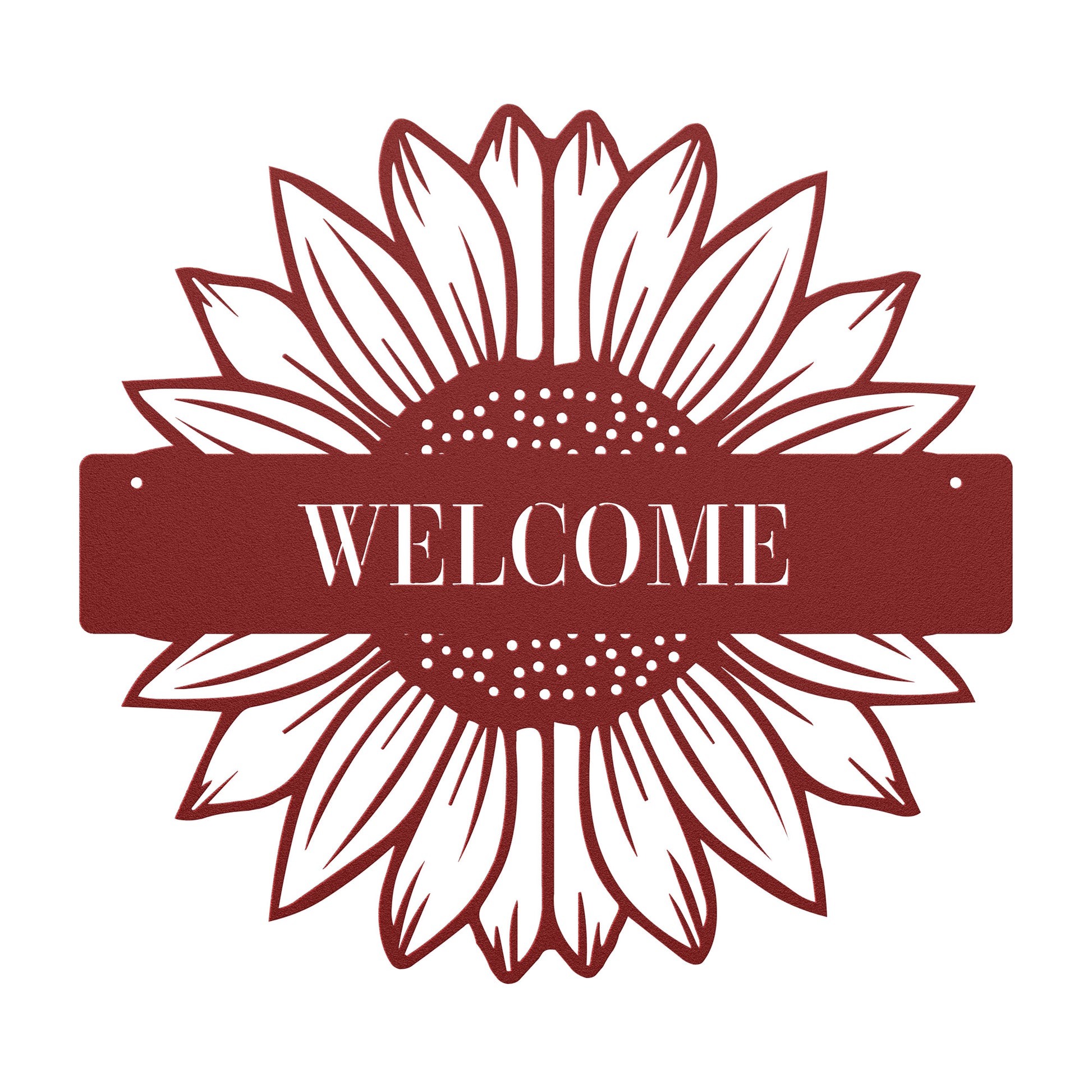 The Sunflower Split Welcome metal sign features a prominent sunflower with the warm welcome message. This is the perfect gift for a family or the perfect addition to your home. The laser-cut steel sign is available in a variety of colors — each perfect for the decor you desire. Each piece has a baked on powder coating to offer a durable finish that can be used indoors or outdoors. Use it to add a unique piece to your holiday collection that will last for years to come.